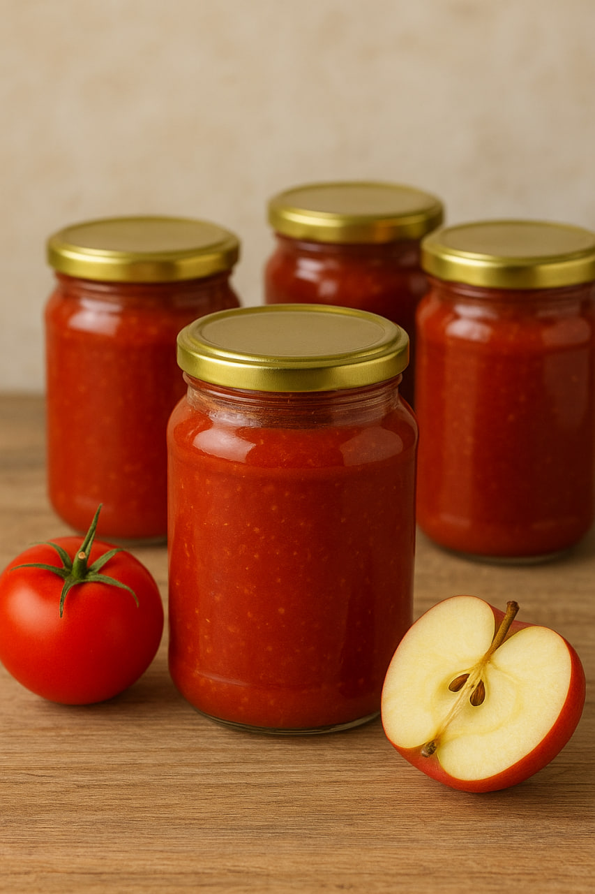 Ніжний, густий і ароматний соус із соковитих помідорів та яблук. Трохи солодкуватий, із легкою кислинкою та пряними нотками перцю — він ідеально доповнить картоплю, м’ясо, шашлик або просто шматочок хліба.