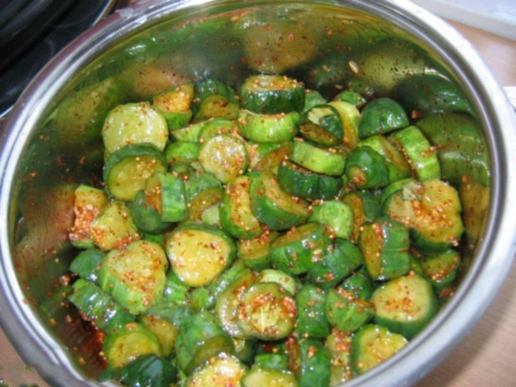 Можно вместо 3 столовых ложек порошкообразного Чили заправить настоящим перцем Чили. Огурцы тогда выглядят симпатичнее, да и вкус лучше.