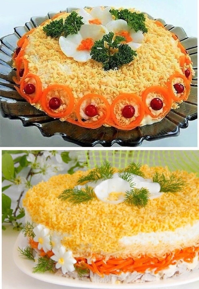Куриное филе отварить до готовности в подсоленной воде. Остудить и нарезать небольшими кусочками. Выложить первым слоем в салатник.Вторым слоем разместить морковь по-корейски, которую нужно измельчить. Смазать майонезом. Следующий слой — тертый на мелкой терке сыр + майонез. Яйца почистить и отделить желтки от белков. Натереть белки на мелкой терке и выложить четвертым слоем. Смазать немного майонезом. Верхний слой — натертые на мелкой терке желтки. Этот слой салата «Бунито» смазывать майонезом не нужно. Украсить салат зеленью или как угодно — по своему желанию. Я украсила соломкой моркови, ромашками из белков, зеленью и клюквой. Поставить готовый салат для пропитывания в холодильник на 2-3 часа.