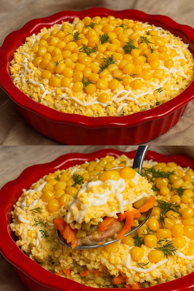 Лёгкий, но сытный салат — идеальное блюдо. Простые ингредиенты, мягкий вкус и красивая подача сделают его любимцем на вашем столе. Обязательно попробуйте — он понравится всей семье!
