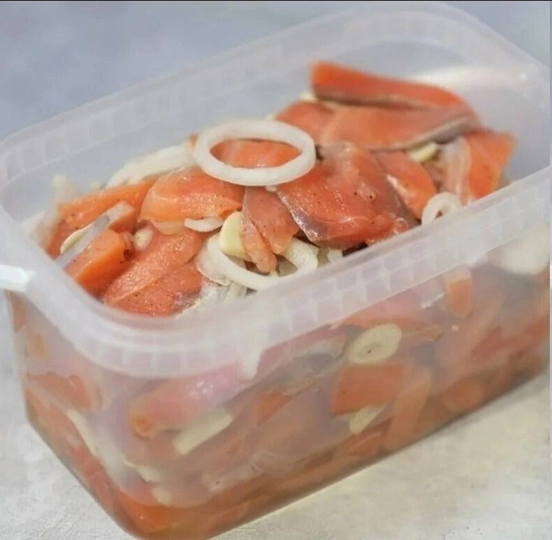 Солена горбуша в олії з цибулею
